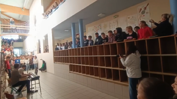 Accompagnés par Timothée Bert à la trompette et Romain Pignard au cajón, tous les élèves du collège se sont rassemblés dans les couloirs pour interpréter la chanson "Ta Planète" de Tryo.