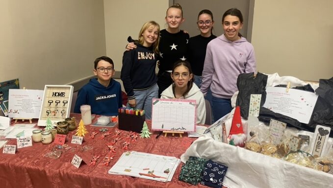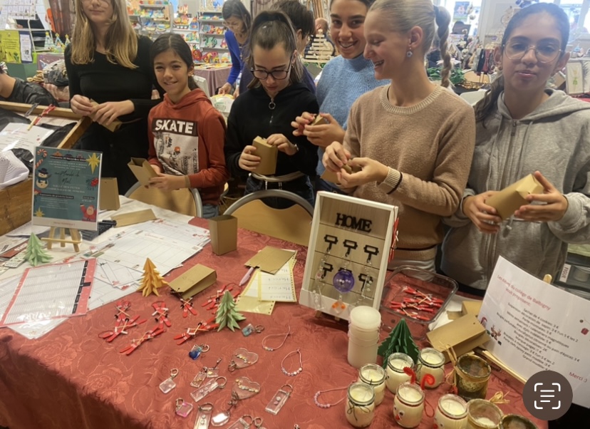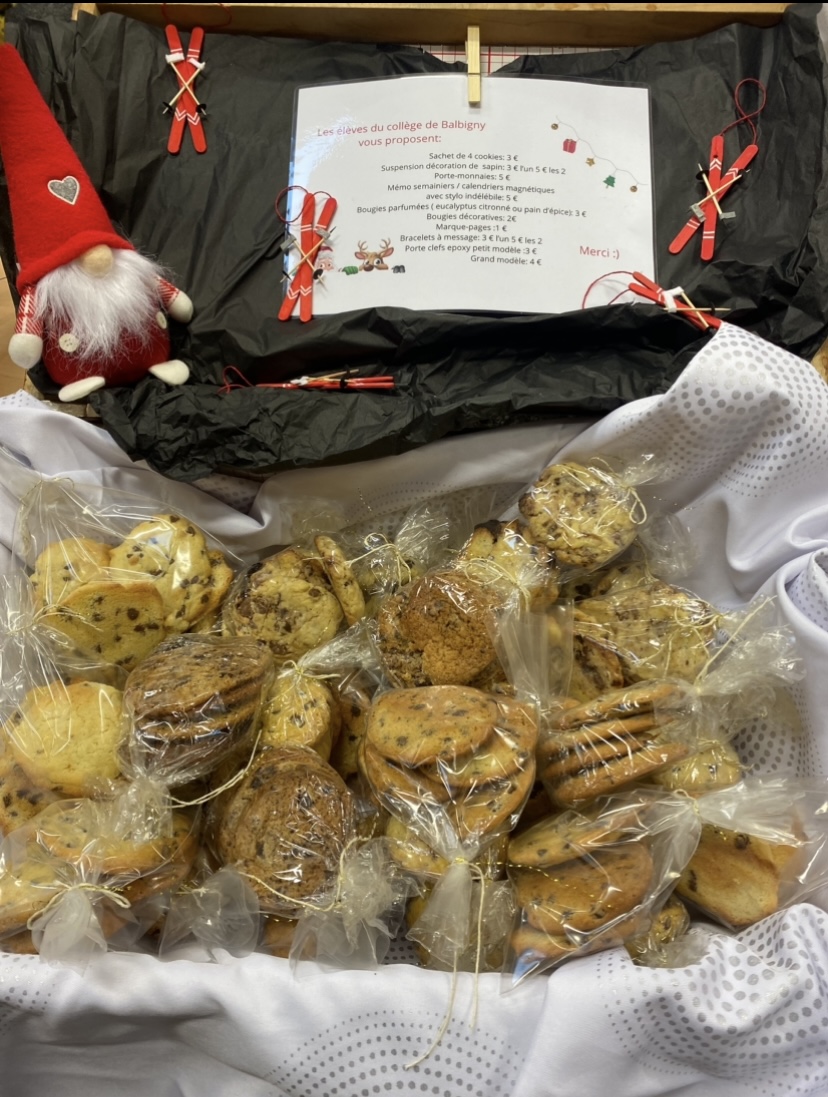 Zia,Violette,Valentine,Alice,Meline,Manon,Nathan,Timothy,Malo,Titouan et Arthur ont tenu le stand pour le FSE du collège au marché de Noël de Mizerieux.