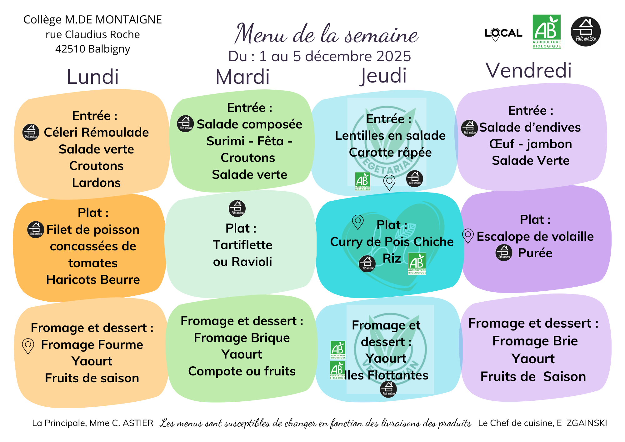 Menu bio et végétarien jeudi 4 décembre,
